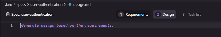 Once you are happy that the requirements.md adequately describes the feature that you want to build you can move to creating the technical design by clicking the Design button at the top of the requirements window and then clicking on the Generate design based on requirements link in the empty design.md file.