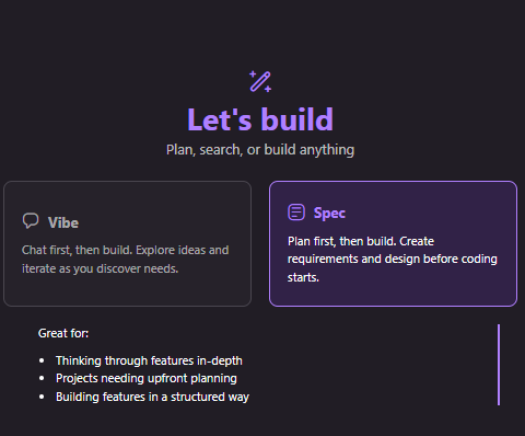 As all the application features are already defined (at a high level) in the product.md steering file (see my previous article for more details), all we need to do is activate spec mode and ask Kiro to implement the feature we want to build.