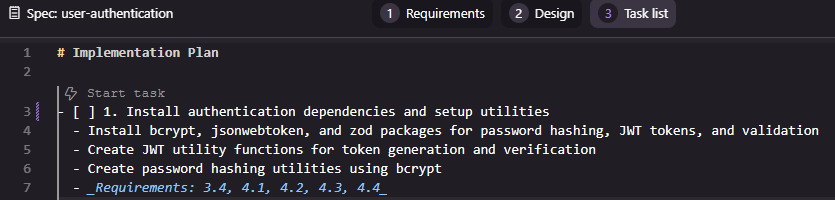 Kiro breaks down the implementation of a feature into into small, focused tasks to in an attempt to improve clarity, and reduce ambiguity. This approach is intended to generate better results from the LLM than attempting to implement an entire feature all at once, as it allows the system to focus on one well-defined objective at a time. Each step can be validated and refined before moving on, reducing compounding errors and ensuring a higher overall quality of output. This structured workflow also keeps the developer-in-the-loop, enabling them to review intermediate results, adjust the plan as each task is completed.